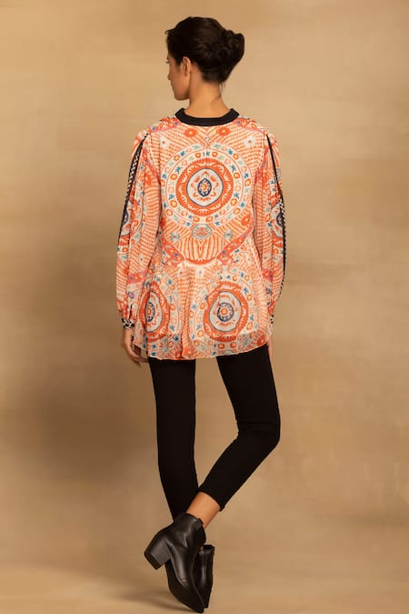 Waistline frill detail, All over abstract print, Balloon sleeves with contrast detailing