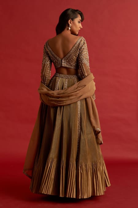 Copper gold pleated lehenga featuring panelled embroidery in nakshi, zardozi, zari, cutdana, swarovski, and nalki work. Paired with a drop shoulder V neck embroidered blouse and a border embroidered sheer dupatta.