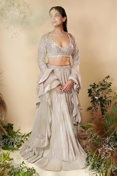 Grey velvet lehenga featuring sequins embroidery at the waistline. Paired with a cut-out padded blouse and a ruffled dupatta.
