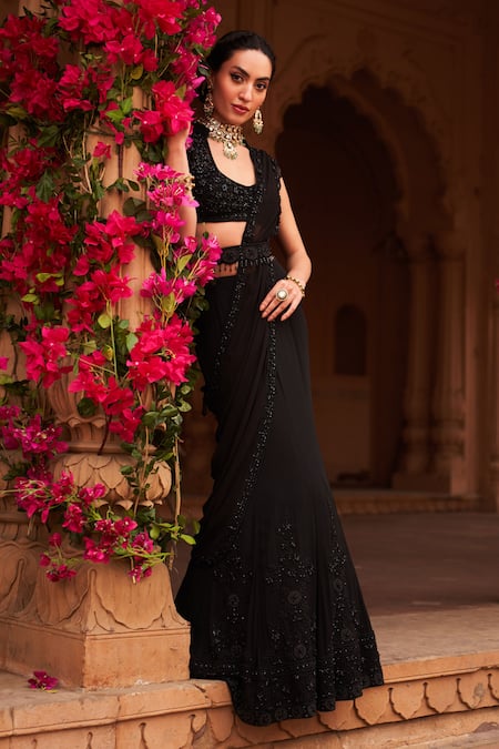 Black pre-draped saree featuring intricate placement embroidery with beads, cutdana, aari, zari, tone on tone Swarovski stone, and velvet patchwork. Accompanied by a padded blouse adorned with all-over tonal embroidery and a matching belt.
