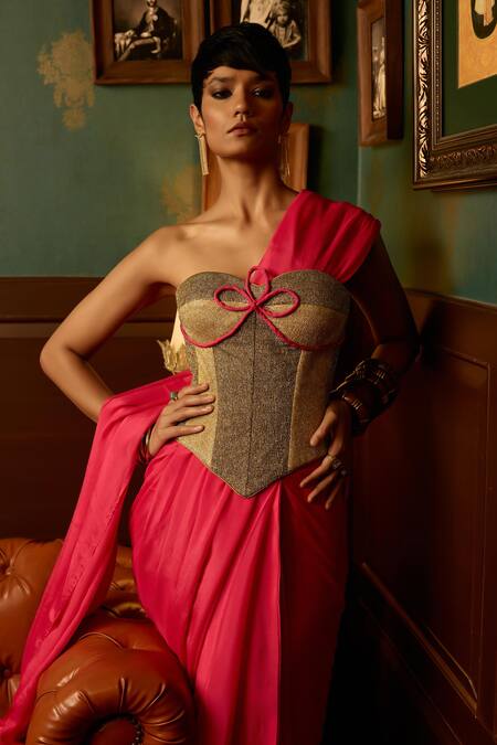 Gold Georgette Bows Sweetheart Neck Pink Saree With Corset Blouse