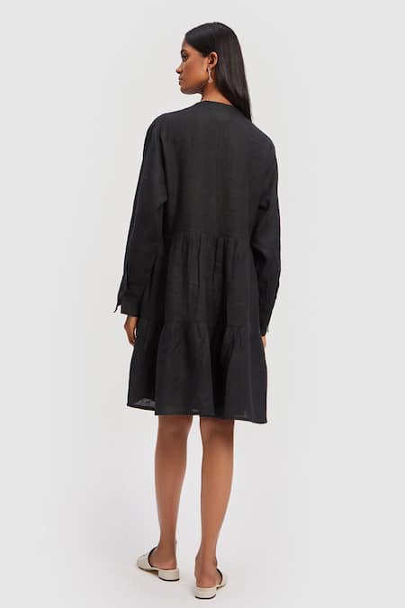 Black hemp tiered dress with band collar V neck, puff cuff sleeves & pleated details.