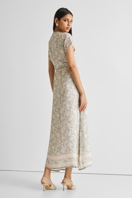 A vintage bouquet white crepe wrap dress featuring a floral print with light blue and grey botanical motifs.