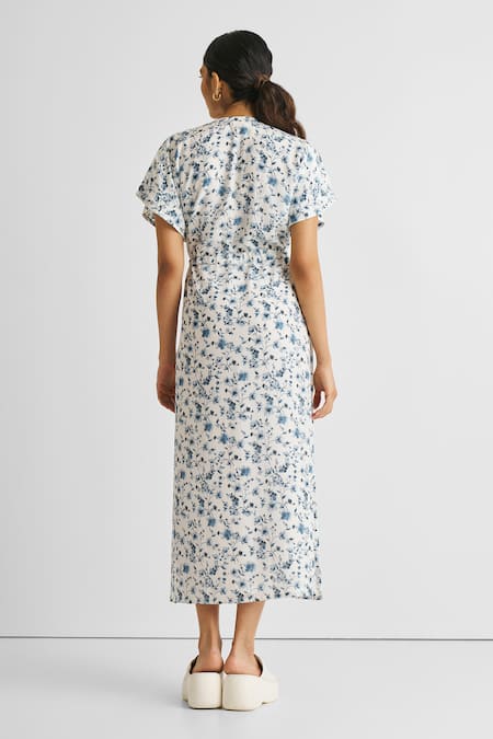 White Crepe V-neck Floral Print Gathered Dress