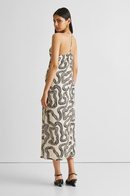 A maze off white crepe dress featuring a V-neck, adjustable straps, and a black abstract maze pattern.