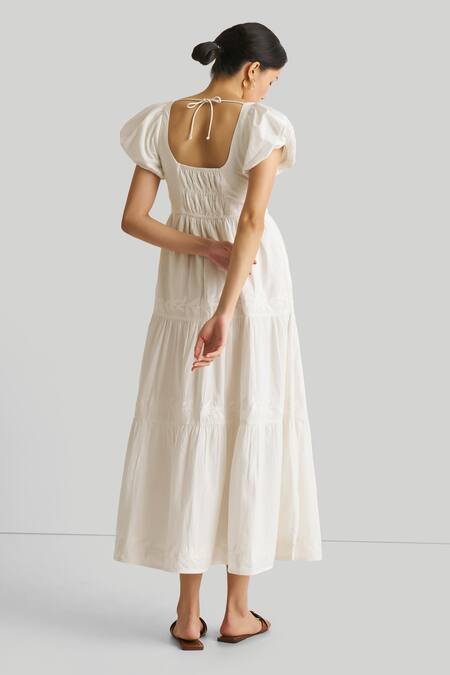 White dress crafted from organic cotton featuring thread embroidery in a floral pattern