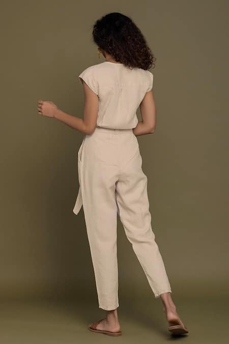 Beige Hemp V Neck Straight-leg Jumpsuit
