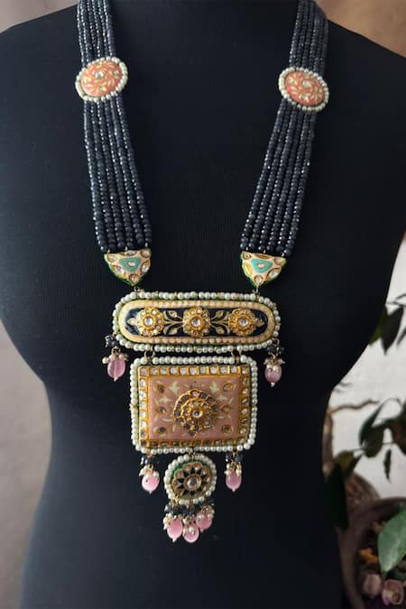 Floral carvings on the pendant, Crystal stone strings, Kundan accents on the necklace