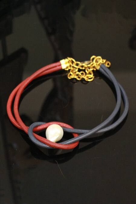 Knot choker necklace featuring blue and red leather cords with white baroque pearl embellishments