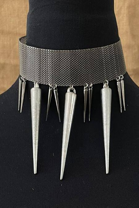 Grey and silver spiked mesh choker necklace featuring a lobster clasp closure