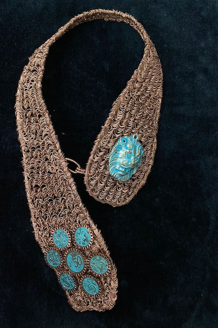 Copper hued jaali necklace featuring turquoise carved tiger and coin motifs