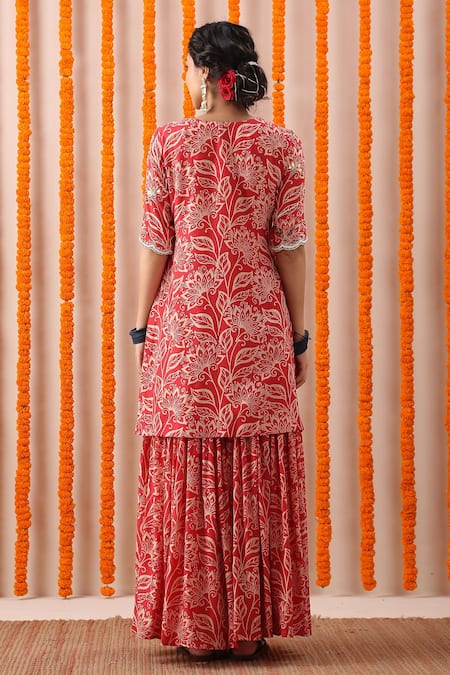 Red kurta with floral block printed motifs and embroidery. Comes with gharara and chiffon dupatta.