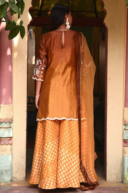Mustard short kurta with floral embroidered motifs & scallop border. Paired with pant and a bandhani printed motifs & organza dupatta.