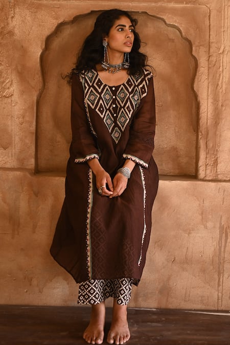 Brown long kurta with geometric hand block prints & embroidered highlights. Paired with printed pant.