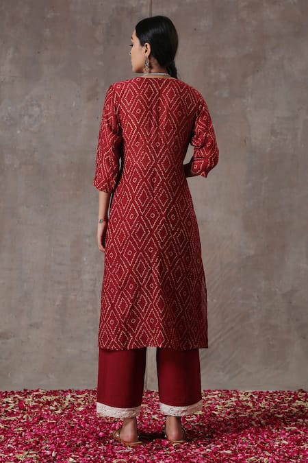 Buy_Rekha Agra_Red Chanderi, Cotton Flax Geometric Motifs V Neck Kurta And Pant Set _at_Aza_Fashions