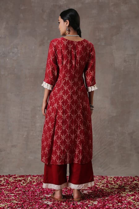 Buy_Rekha Agra_Red Chanderi And Cotton Flax Block Print & Pearl V Neck Kurta & Pant Set _Online_at_Aza_Fashions