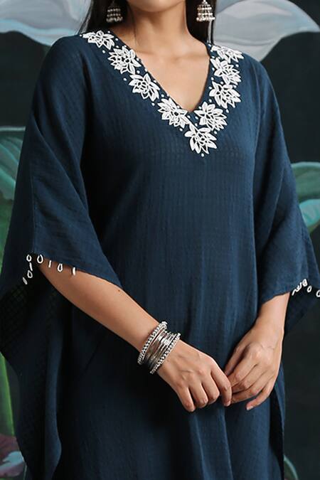 Buy_Rekha Agra_Blue Cotton Slub V Neck Embroidered Kaftan Tunic _at_Aza_Fashions