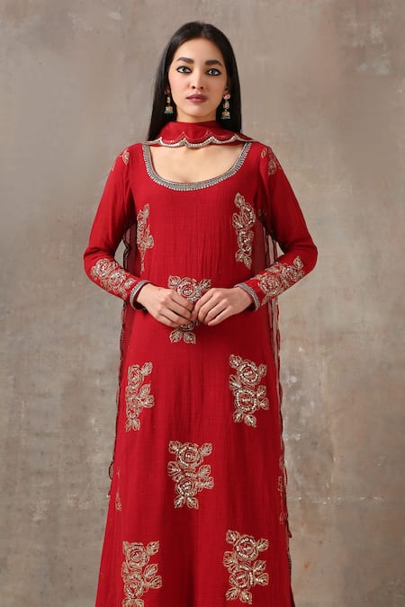 Red kurta with floral printed motifs & aari embroidered. Paired with pleated palazzo & organza scallop dupatta.