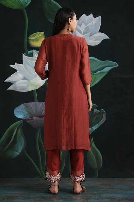 Rust kurta with floral beaded embroidery and notched neckline. Comes with straight fit pant and leheriya dupatta.