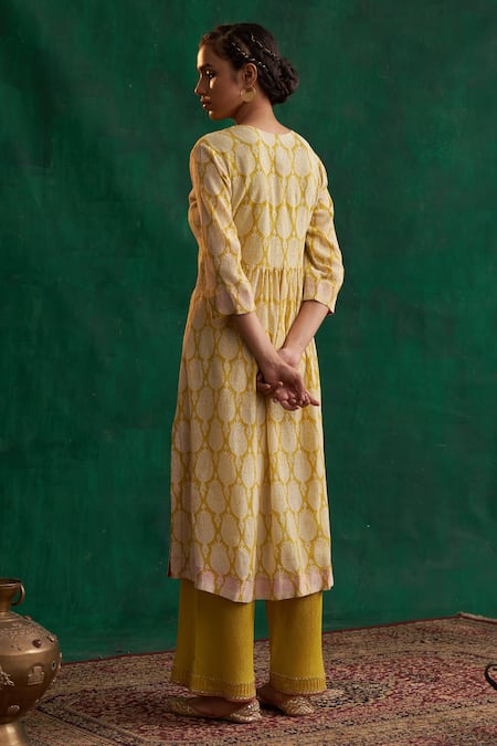 Lime green crinkled cotton silk kurta with floral hand block print, front gathered detail, thread, sequin, cut dana & pearl hand embroidered yoke. Paired with pants.