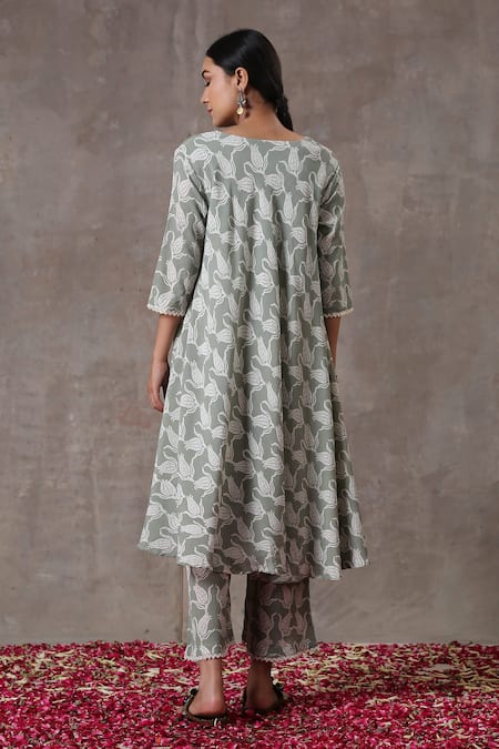 Buy_Rekha Agra_Green Crinkled Cotton Silk Floral Motifs V Neck Print Kurta And Pant Set _at_Aza_Fashions