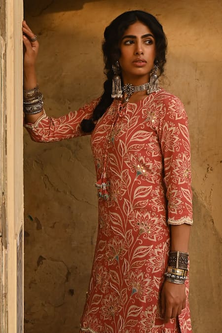 Peach crinkled straight short kurta with floral motif prints & embroidery. Paired with printed Gharara & dupatta.