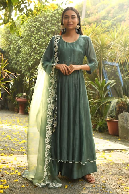 Ocean blue anarkali with scallop border & bead work. Paired with palazzo & floral embroidered dupatta.