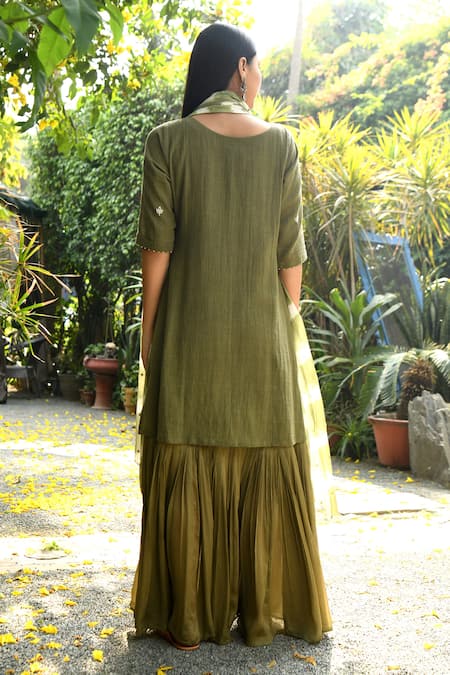 Green kurta with floral & leaf embroidered motifs, gharara attached layer & bead work. Paired with leheriya scallop dupatta.