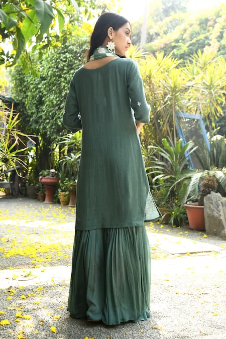 Blue kurta with floral & leaf embroidered motifs, gharara attached layer & bead work. Paired with leheriya scallop dupatta.