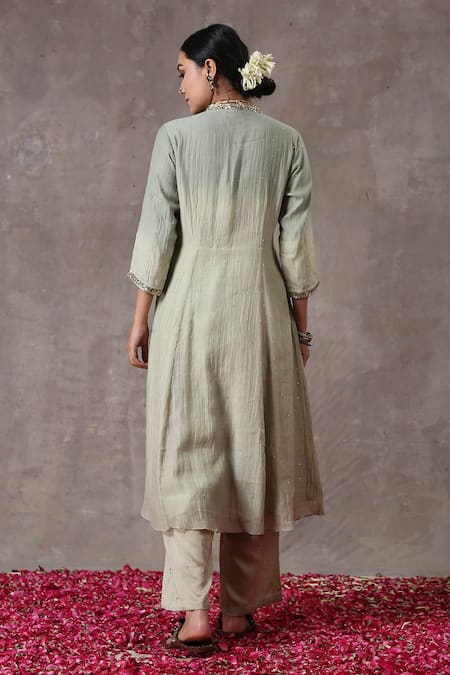Buy_Rekha Agra_Green Organza, Chanderi, Cotton Silk Mukaish Work V Neck Embroidered Kurta Set _Online_at_Aza_Fashions