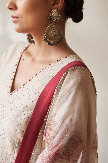 Ivory Anarkali featuring a V neck, full sleeves, and floral embroidery on the sleeves. Paired with a pleated palazzo and a dupatta with a contrast red border and mirror embroidered detailing.