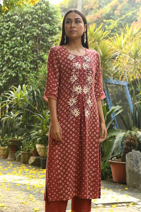 Rust kurta with bandhani printed motifs, scallop hem & floral embroidered motifs. Paired with scallop hem pant.