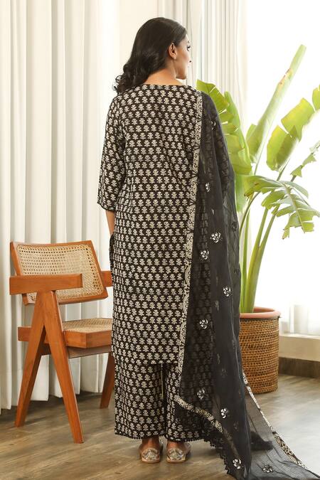 Black Cotton, Doriya Hand Block Print, Thread Rekha Floral Kurta Palazzo Set