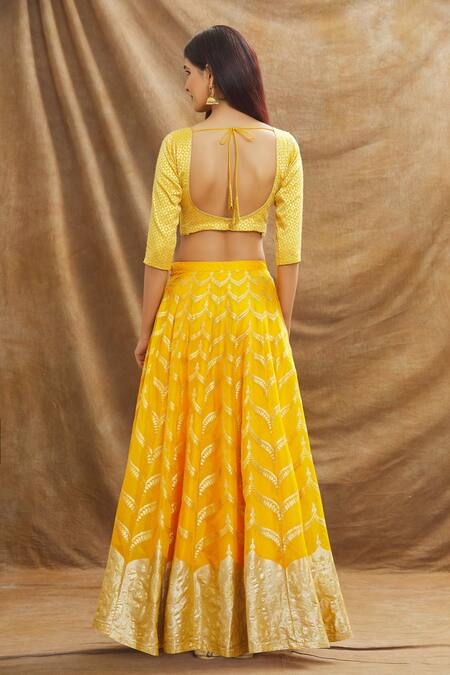 Yellow kora silk lehenga featuring an all-over chevron pattern. Paired with a blouse showcasing a geometric motif and a matching dupatta.