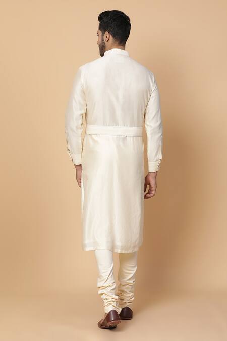 Off-white layered kurta in chanderi silk base with resham & dabka hand embroidery. Paired with churidar & belt.