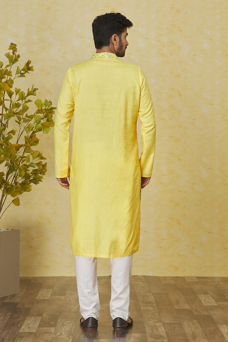 Yellow kurta featuring a mandarin collar, full sleeves, and embroidered floral resham work. Paired with contrast pants with side pockets.