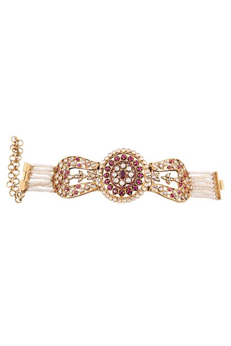 Motifs are inspired by the regal architecture of India and handcrafted into silver jewelry. This is an ornately crafted gold polish bracelet, set with crystals and fresh water pearls. Made in Jaipur, Rajasthan.