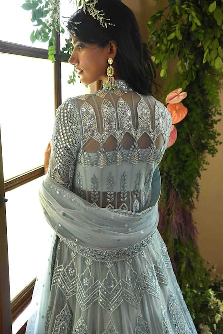 Pastel aqua net sheer long jacket with shade of mirror work, zardozi bead work & Swarovski embellishments. Comes with chanderi lehenga & dupatta.