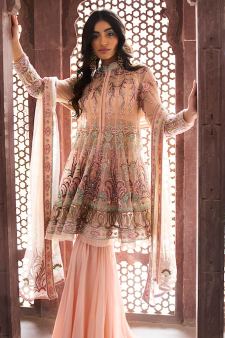 Peach Lining Shantoon, Soft Net Band Collar Embellished Bandhgala Sharara Set