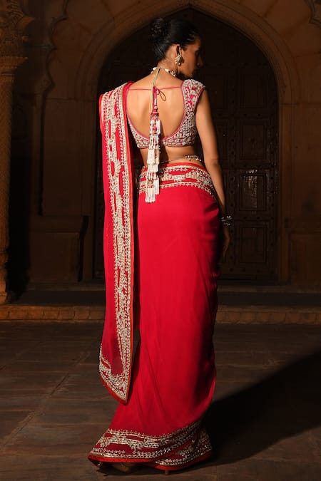 Pink saree with floral embroidered border. Paired with pearl embroidered blouse.