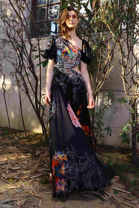 Black maxi gown with multi colored printed floral motifs, embellished with pearls, side cut-out & balloon sleeves.