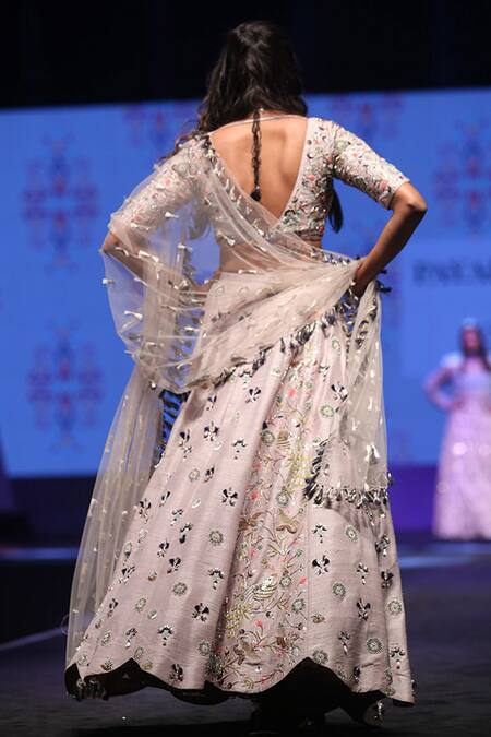 Grey dupion silk lehenga with floral embroidery. Paired with embroidered choli & net dupatta with tassels.