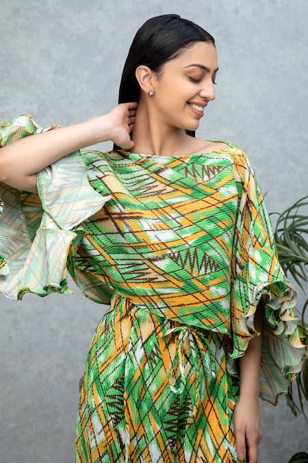 Green Pleated Abstract Print Boat Neck Cynthia Cape