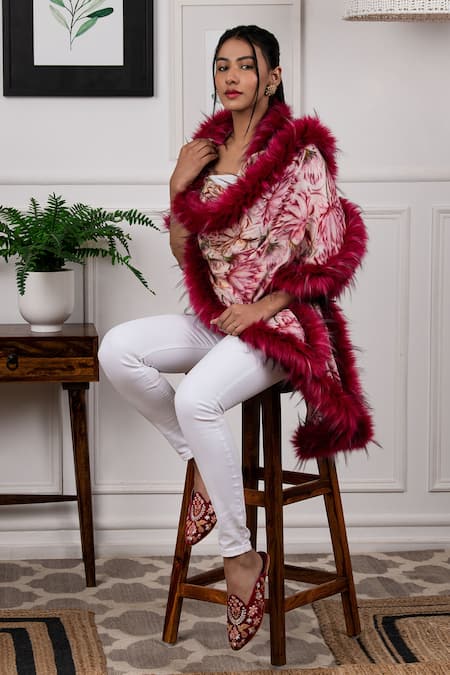 Red shawl featuring floral printed motifs and contrast faux fur trim on all four sides