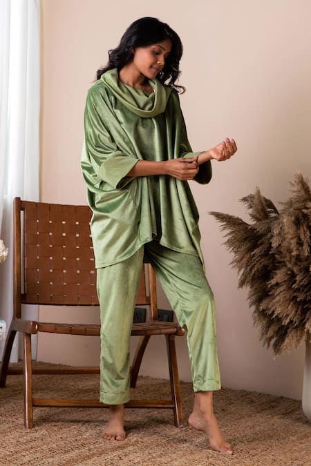 Green 100% Polyester Plain Cowl Neck Wallis Top And Joggers Set