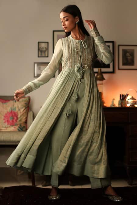 Buy_Rhua_Green Anarkali - Tissue Chanderi, Dupatta - Velvet, Pant- Embroidered Set_Online_at_Aza_Fashions