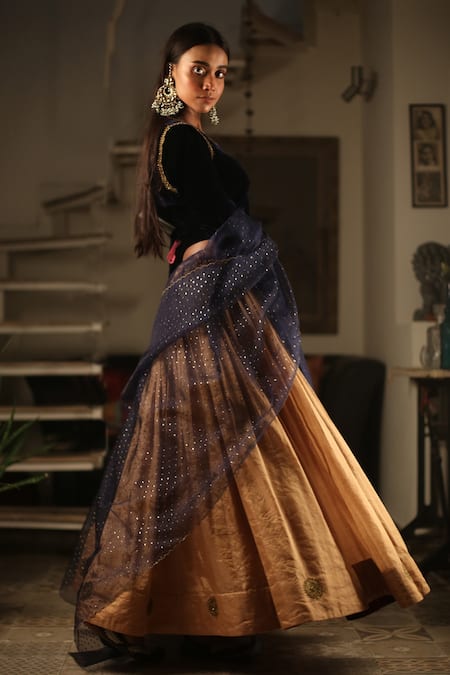 Blouse- Velvet, Dupatta- Organza, Lehenga- Banarasi Tissue Silk