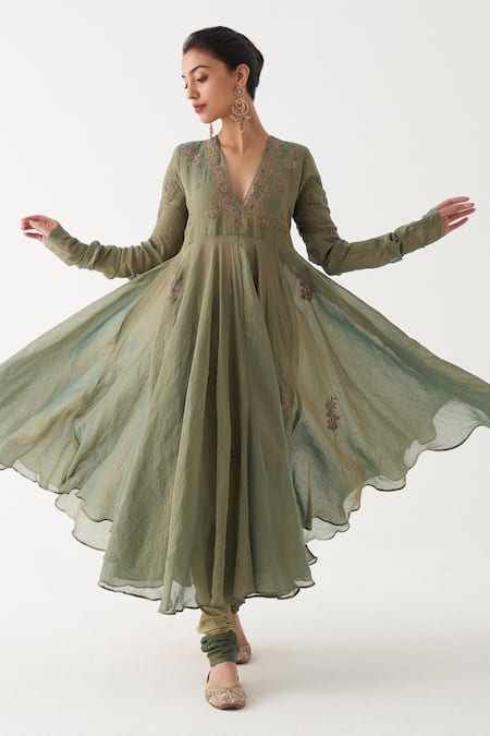 Green Churidar Cotton Silk, Kurtaand Dupatta Kiara Embroidered Anarkali Set