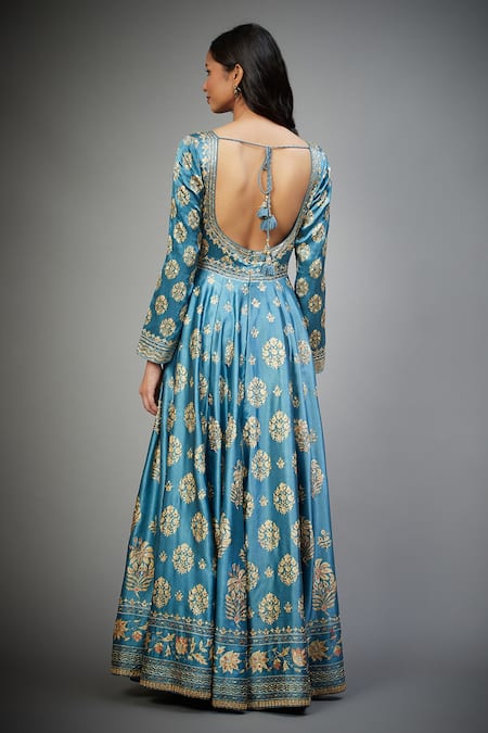 Blue anarkali with floral printed & aari embroidered motifs. Paired with churidar & sheer dupatta.