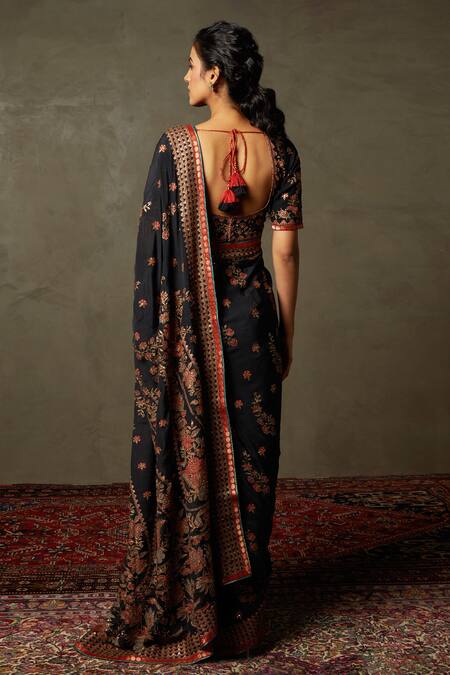Black Silk Chinnon Embroidered Floral Avena Print And Aari Work Saree